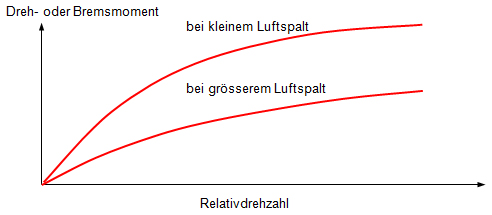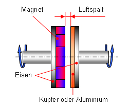 Bei Wirbelstromkupplungen oder Bremsen steht ein mehrpolig magnetisierter Magnet einer Aluminium- oder Kupferscheibe gegenüber die mit einer Eisenscheibe gleichen Durchmessers verbunden ist. Das Dreh- oder Bremsmoment ist abhängig von der masslichen Auslegung, dem Magnetwerkstoff, der Polzahl, dem Luftspalt und der Relativdrehzahl. Je höher die Geschwindigkeit, umso höher ist das übertragene Dreh- oder Bremsmoment. Falls erforderlich, ist eine leichte Regelbarkeit des Momentes durch axiales Verschieben, d. h. durch Veränderung des Luftspaltes und damit des Nutzflusses möglich. Da sich Wirbelstromkupplungen und Bremsen infolge der Ausbildung von Wirbelströmen mit wachsender Geschwindigkeit stark erwärmen, fallen die Werte des erzielbaren Dreh- oder Bremsmomentes je nach erreichter Temperatur stark ab.