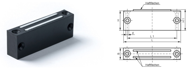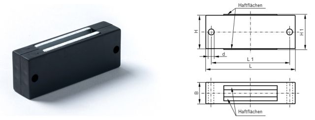 | Item-no. | L | B | H | H1 | L1 | L2 | d | L3 | d1 | h | Force (kg) | Color |